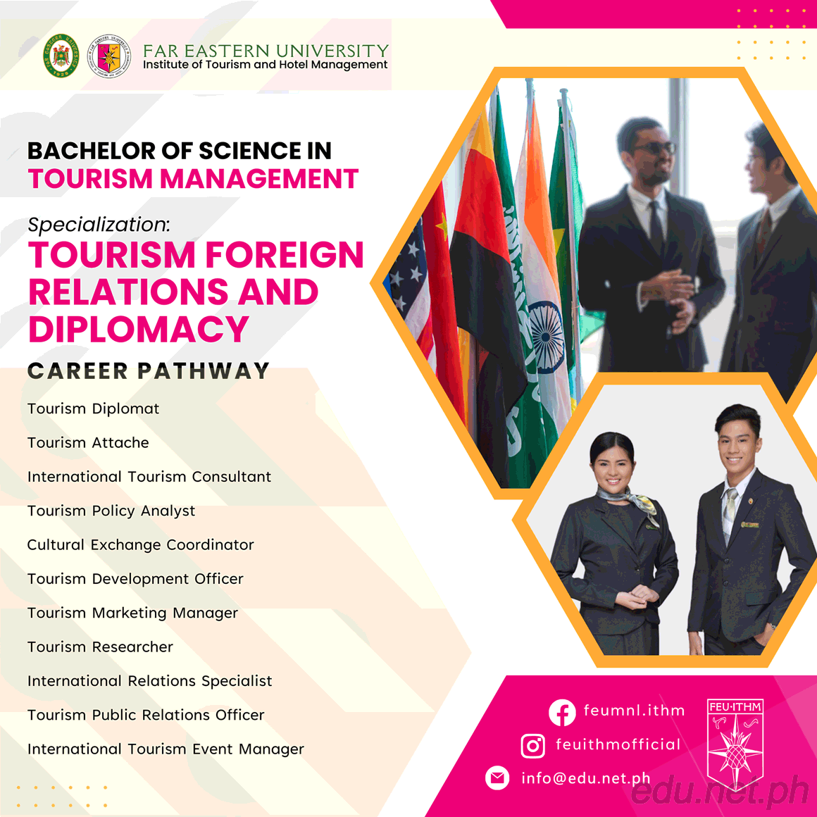 根据 FEU 的使命和愿景,BS 旅游管理课程通过提供该领域最优秀的专业人才来满足旅游业的高标准。它致力于培养能够在迅速变化的全球旅游环境中发挥领导和创新作用的毕业生,同时体现 FEU 坚韧、卓越和正直的核心价值观。
